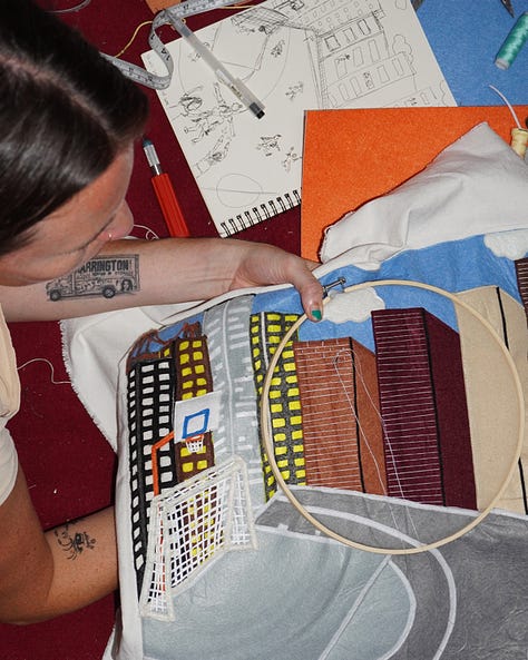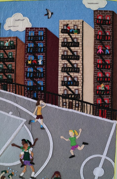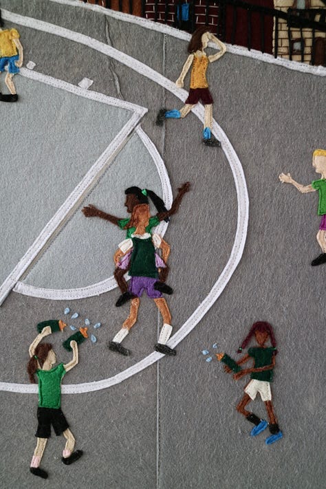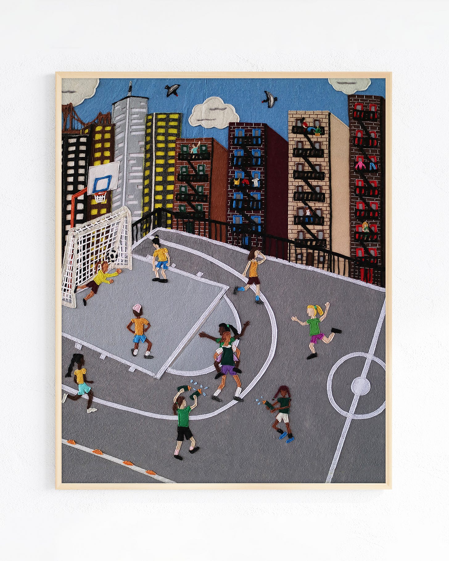 This piece was fun to make because I approached the football goal net & the basketball hoop net by hand stitching them, so it adds a new texture in a nice way. The bricks on the buildings are also hand sewn, a technique I’ve used in past pieces. “Ya Win Some, Ya Lose Some” is a part of an overarching new series of mine (which I’ll go more into detail in upcoming letters) but the concept of the series is a love letter to the subcultures and communities that have offered me a sense of belonging—from sports to hobbies and from friendships to shared creative pursuits. This specific piece is clearly very much inspired by street football experiences in NYC. It also reflects on a theory I learned through sports, but try to apply to life: don’t get too down when you lose // don’t let it get to your head when you win.